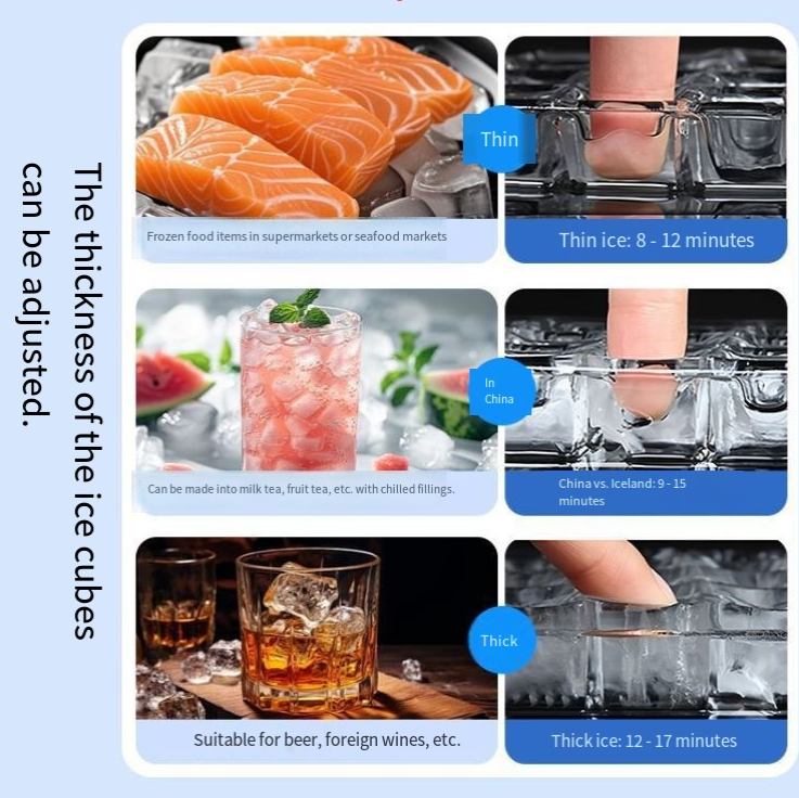 From the perspective of scene adaptation, it is undoubtedly a "all-rounder". During family gatherings, it can quickly supply a large amount of ice cubes to meet the ice-drinking needs of everyone; when alone, the compact size of it doesn't take up much space, and it can be placed in the corner of the kitchen to make ice cubes at any time for you; even small tea shops and coffee shops can rely on it to improve the service efficiency and deliver timely refreshing ice drinks to customers.