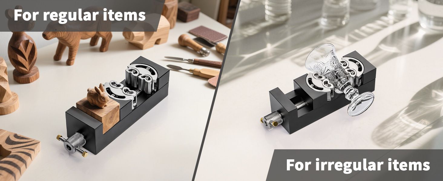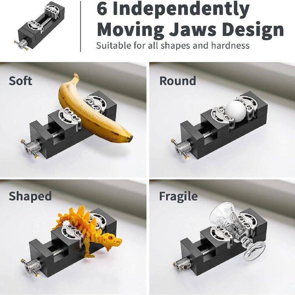 The fractal precision vise that breaks free from the limitations of traditional fixtures: 6 independent movable jaws form a complete shape and hardness-adaptive system. It covers both 58mm regular workpieces and 62mm irregular workpieces. It can easily fix various objects such as bananas, spheres, dragon-shaped ornaments, and glassware. It replaces the traditional single-point force-bearing and easily-sliding tool with a new option of multi-contact stable clamping.