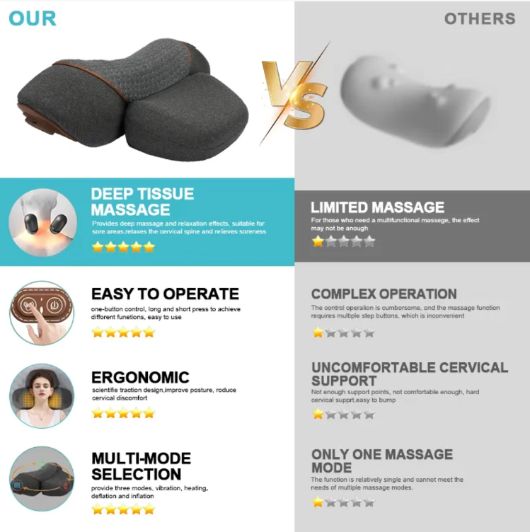 Compared with other similar products on the market, our massage pillow has significant advantages. Other products may have problems such as a single massage function, complex operation, and insufficiently comfortable cervical support. However, our massage pillow not only provides deep tissue massage and relaxation effects, suitable for sore areas, but also offers multiple function modes, including vibration, heating, inflation and deflation. At the same time, its ergonomic support design can better fit the cervical spine, providing comfortable support, allowing you to enjoy the massage while feeling meticulous care.