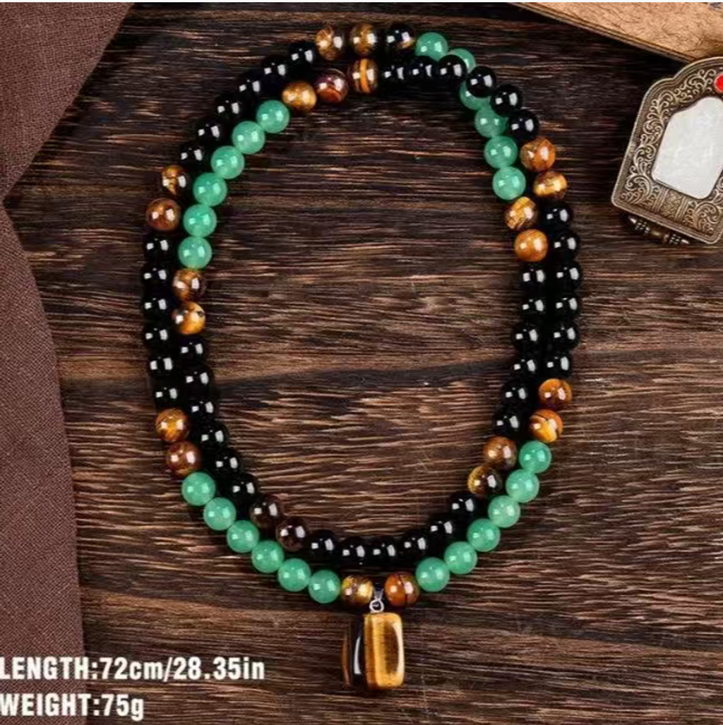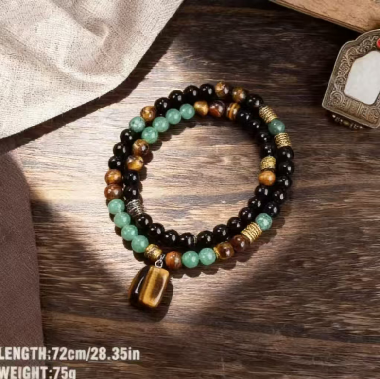 The necklace is 72 cm in length (can be looped around the neck 2-3 times), presenting the right balance of layers. The round and full beads, the glossy finish of tiger eye stone, the matte finish of black agate, and the jade-like texture of green turquoise complement each other, paired with a tiger eye stone pendant, as if condensing the wildness of the mountains and forests into a square inch. The weight of 75g is substantial, feeling alive in the palm, and the more you play with it, the more the luster becomes warm and smooth, like a dialogue with oneself.