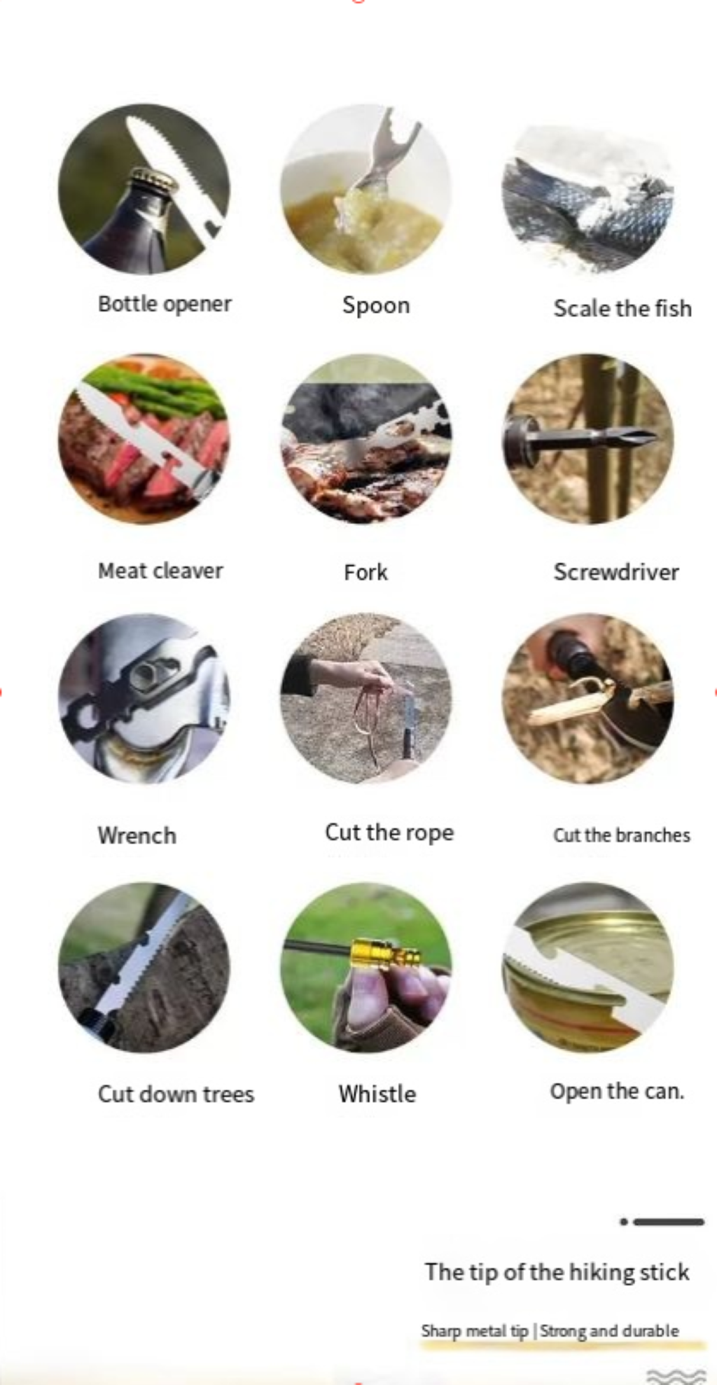 It is made of aluminum alloy, combining strength and lightness. Its "Lightweight and portable" characteristics ensure that you won't feel cumbersome during long hikes. As a "MULTI-PURPOSE TREKKING POLE", it is not only a support tool for walking - the built-in "Outdoor tactical knife" can be used for cutting ropes, handling ingredients; it also integrates various functional components such as a fork, saw, can opener, etc., allowing you to handle outdoor cooking, camp setup, and unexpected situations with ease.
