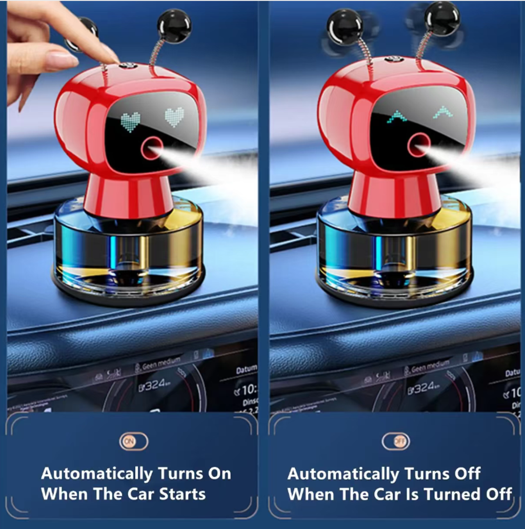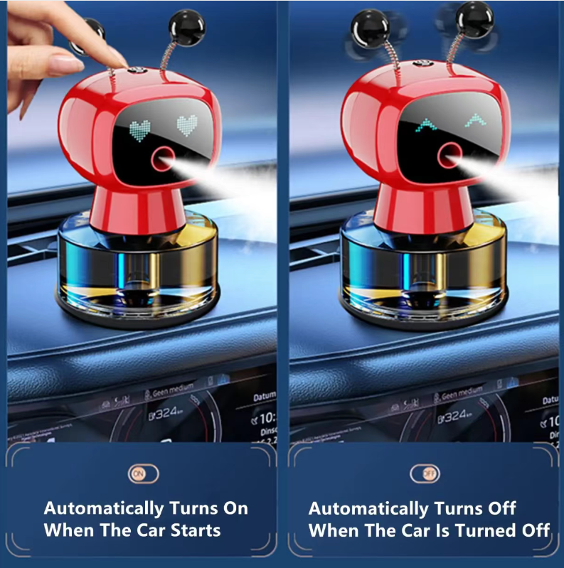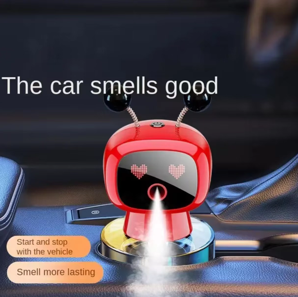 This cute robot car diffuser automatically sprays fragrance when the car starts or stops, with four levels of intelligent fragrance adjustment. The fine mist is not irritating to the nose. The fragrance storage lasts for a long time and requires less refills. The red and rosy body brings dynamic visual effects. It not only functions as a car fragrance diffuser but can also be placed on a desk or entrance as decoration. When waiting for the lights, touching the antennae can also relieve stress.
