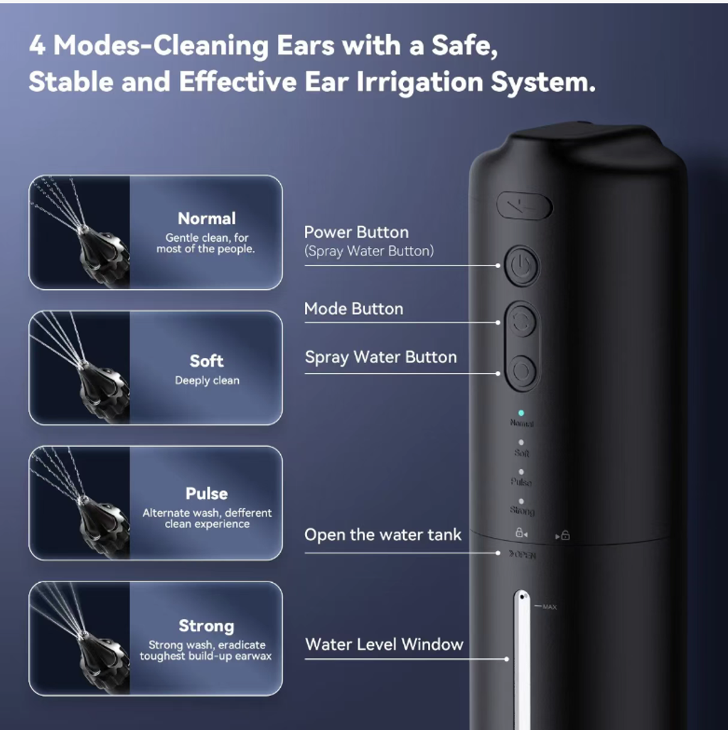 It is the "all-inclusive ear protection expert": 4 cleaning modes precisely match different scenarios - the "Normal" mode is for daily cleaning, the "Soft" gentle setting is for beginners, the "Pulse" alternating wash mode is for those who want to try different experiences, the "Strong" powerful setting is for stubborn earwax, and there's no need to guess blindly by "feel" anymore. It can meet the needs of the entire family.