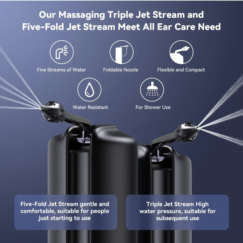 The water flow design also addresses "newcomer concerns": the five-stream water flow is gentle and soothing, and it won't irritate the ear canal when first used; the three-stream water flow has sufficient pressure to deal with stubborn hard earwax - the folding nozzle can be easily stored in the toiletry bag and is waterproof, so it can be used even during a shower. When the ear canal is softened by warm water, cleaning efficiency doubles.
