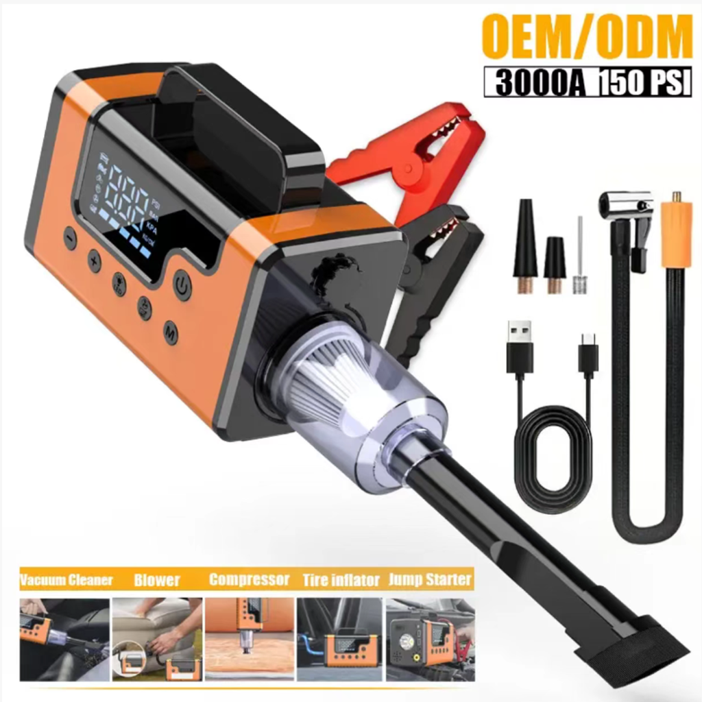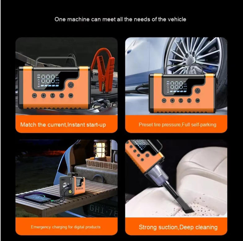 This eight-in-one air pump is a must-have for outdoor vehicle enthusiasts! It can start dead batteries, automatically inflate tires according to preset pressure, remove dust from the vehicle interior, blow away floating dust, come with a strong light warning device, charge your phone, and serve as a complete toolbox. It's a one-stop solution for both in-car and outdoor needs, offering great convenience. It seamlessly integrates all these functions into a practical device.