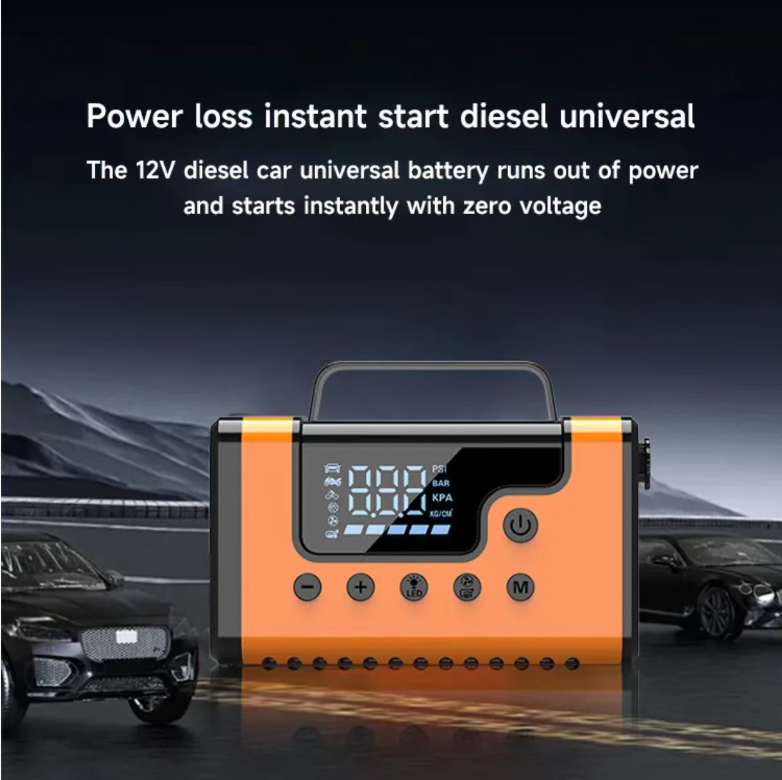 It is the "Auto Savior": The 3000A peak current can start 12V gasoline / 6L diesel vehicles. When the battery is low, simply connect the battery and it can start the engine. The built-in air pump supports preset tire pressures. It can inflate tires of cars, motorcycles, bicycles, even basketballs and inflatable beds. It stops automatically when the pressure reaches the set value, with an accuracy that prevents tires from bulging.