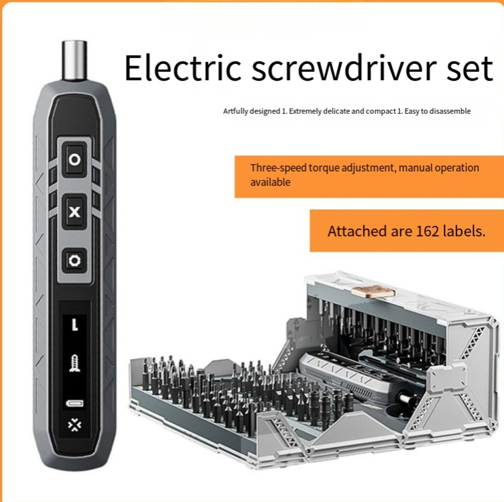 This electric screwdriver set is meticulously designed and compact. It features a built-in strong magnetic quick-change bit. It offers three torque adjustment settings and supports manual mode. It comes with 162 labeled bits and a convenient storage box. The three torque modes are suitable for various working conditions, making it an efficient and precise tool for disassembly, assembly and maintenance.
