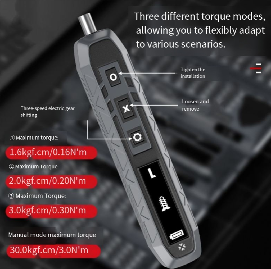 It is equipped with three levels of electric torque adjustment + manual strong mode: the electric mode has torque ranges of 0.16N・m, 0.20N・m, and 0.30N・m, allowing for precise disassembly and assembly of electronic devices such as mobile phones and headphones; the manual mode has a torque of up to 3.0N・m, making it effortless to handle furniture assembly and hardware fastening. The one-button reverse rotation design makes screwing as smooth as "gliding effortlessly", completely eliminating the effort and inefficiency of manual rotation.