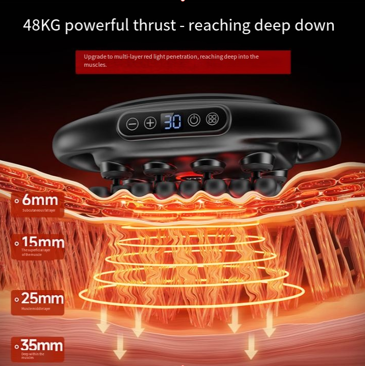 The core black technology of this device lies in the 48KG high-power thrust, combined with 30 human-like massage heads, which can simulate the "deep massage" movements of a professional masseur. Whether it is the surface muscle tension (6mm), the accumulation of lactic acid in the middle layer (15mm), or the deep fascia adhesion (25-35mm), all can be broken through.