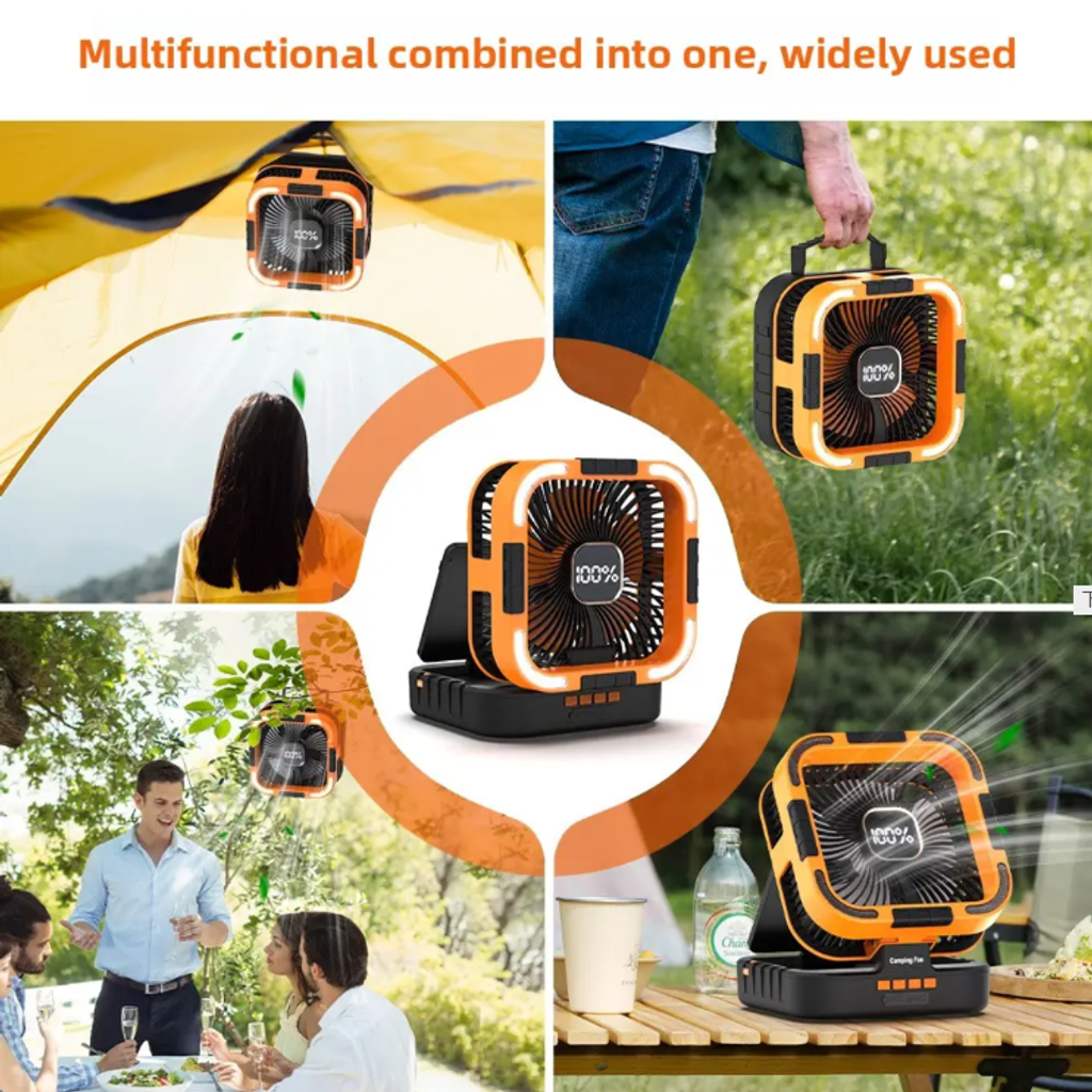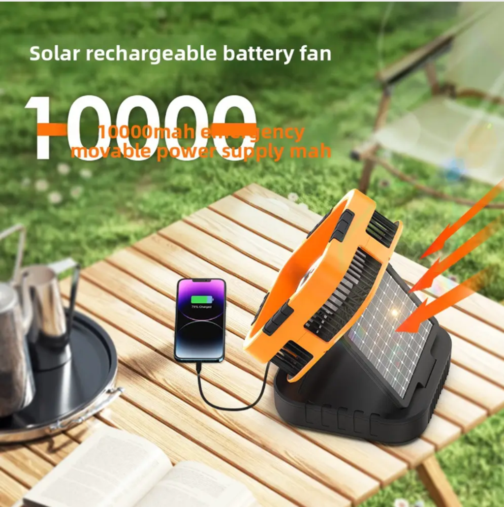 This foldable solar camping fan integrates 6 adjustable fan settings, an LED light, and a 10000mAh charging battery. It supports solar power + USB fast charging and is foldable and portable. It is a cool and convenient tool for outdoor scenarios such as camping and picnics.