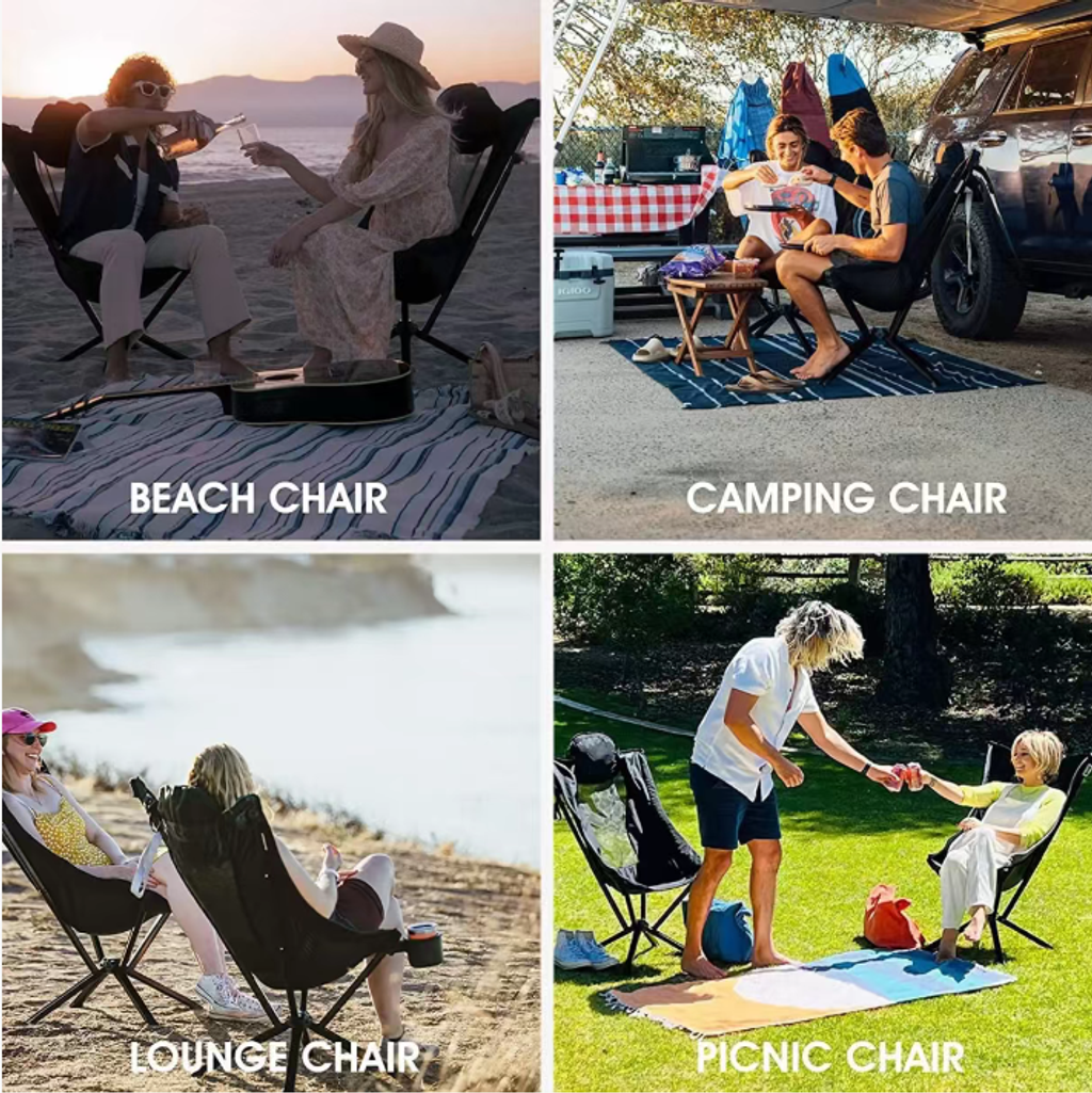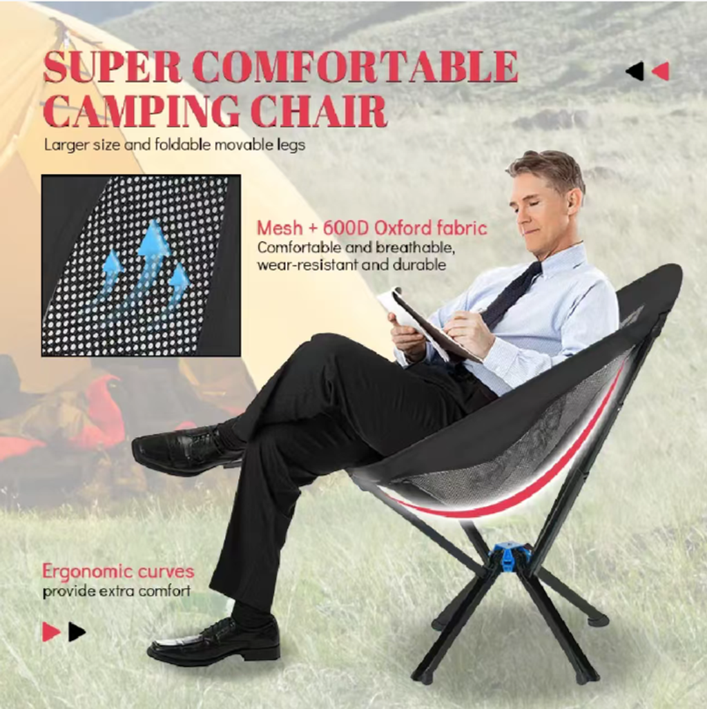 The seating experience is like sinking into a sofa: the ergonomic curvature just fits your waist and back perfectly, and the mesh surface is breathable and doesn't make you sweat. Even if you camp for an entire afternoon in summer, your back will only feel cool wind, unlike ordinary folding chairs that make your back sore. The widened size allows even big people to stretch their legs, and you can either lie down and watch the sky or just relax by lying down. You can do whatever you want to relax.