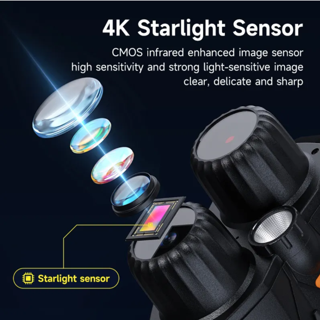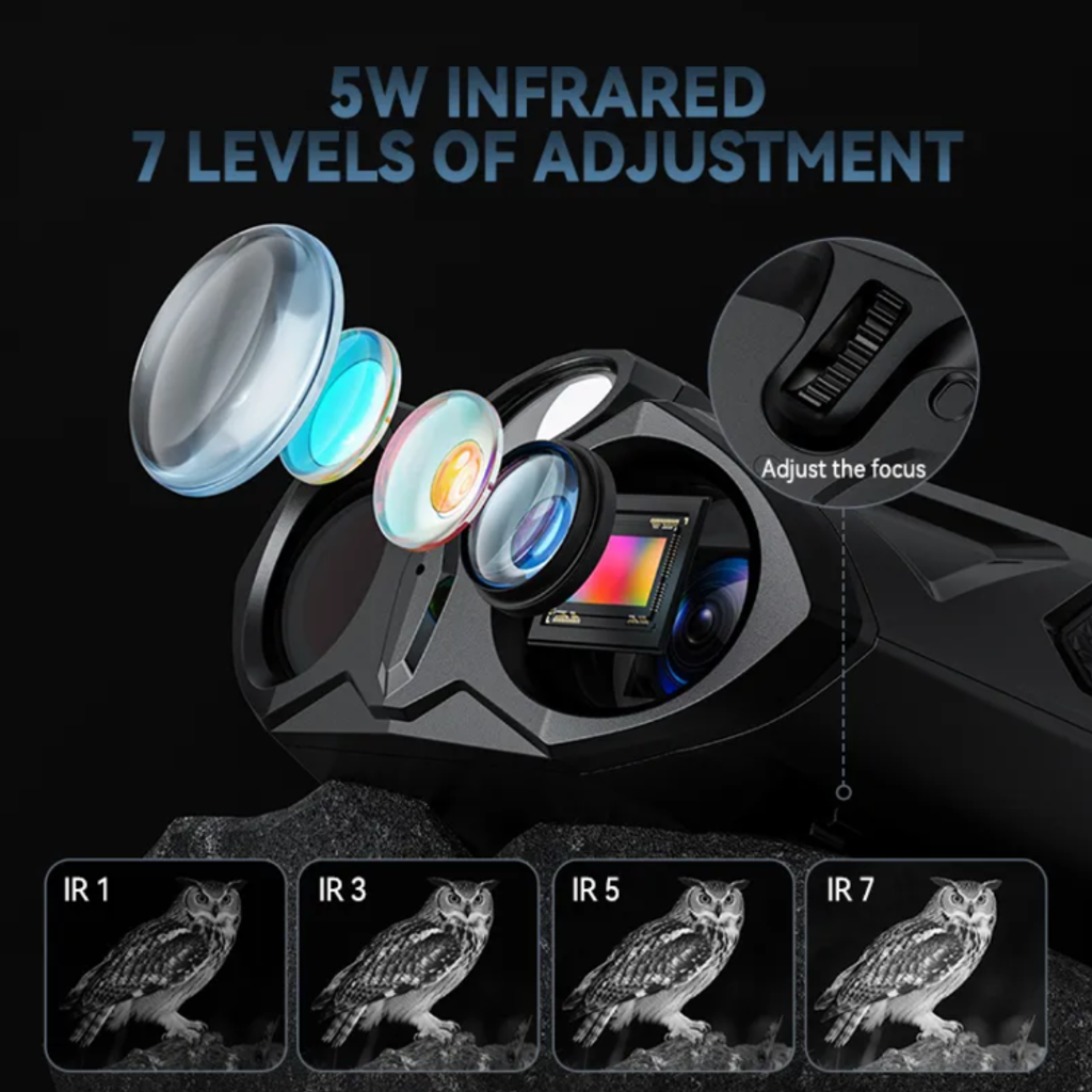 It is equipped with a 5W high-power infrared illuminator, along with a 7-level sensitivity adjustment knob. It can handle both low-light environments and complete darkness scenarios with ease. In complete darkness, the observation distance can reach 800 meters. Whether it's the outline of distant wild animals or hidden details, they can all be captured clearly. It has a built-in 4K starlight-level CMOS sensor, and the infrared enhanced imaging technology makes the picture detailed and sharp, eliminating the "blurry noise" of traditional night vision devices. Every observation feels like watching a high-definition black-and-white movie.