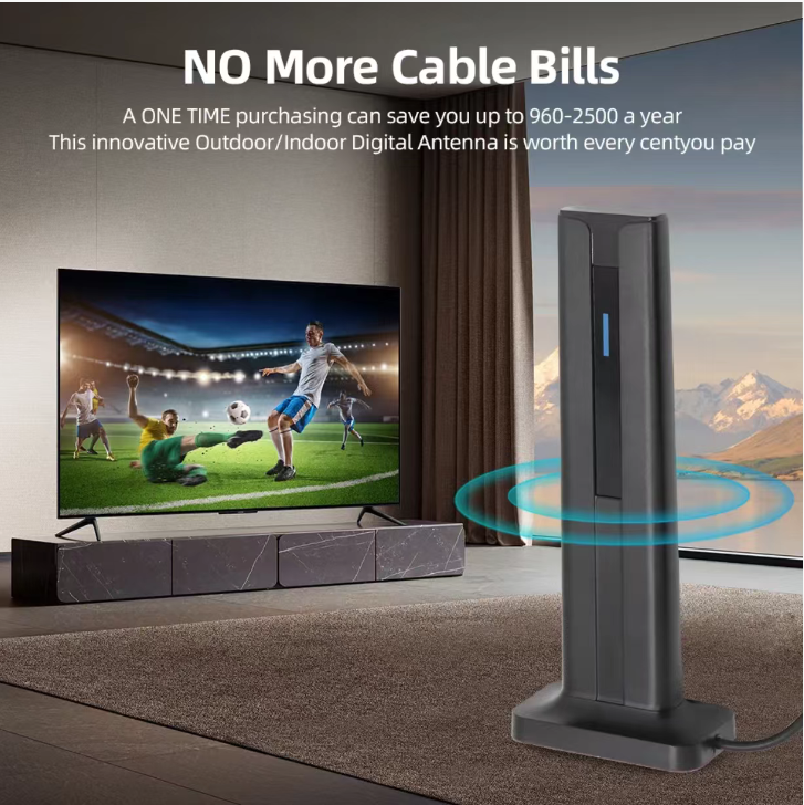 This HDTV antenna can save you 960 - 2500 yuan in annual cable TV fees. It can be easily connected to the TV set-top box in two steps. It provides a strong signal of up to 150 miles, with high-definition and no snowflakes. It is portable and suitable for renting, camping, placing in corners and stable reception of the TV channel. There's no need to spend extra money on the basic channels,you can still watch the high-definition channels freely.