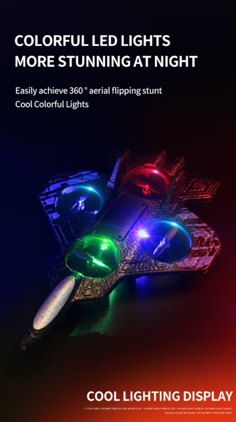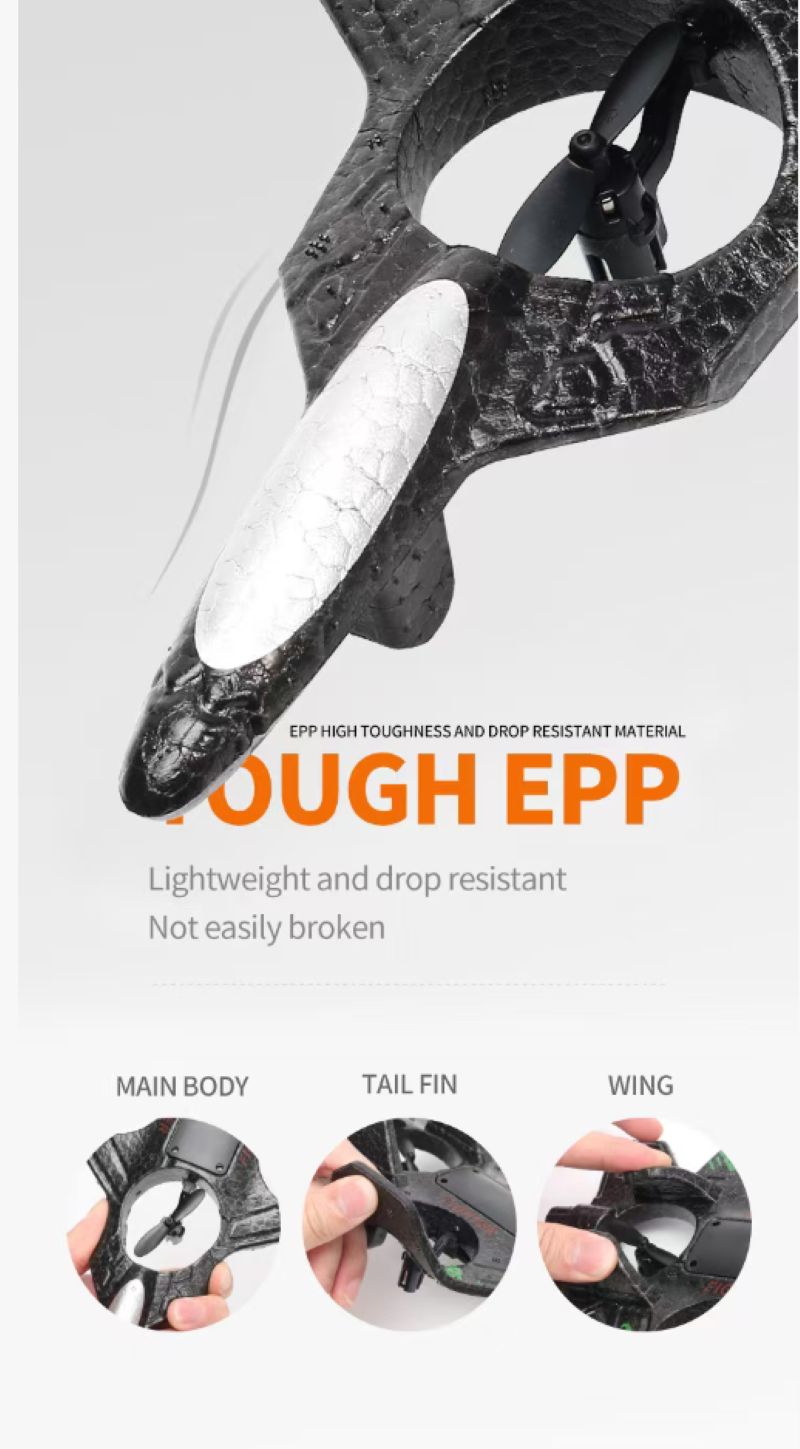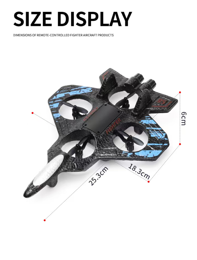 It is an "aerial toy" with both good appearance and strong capabilities: The black and blue camouflage on the fighter jet shell gives it a futuristic look. The EPP lightweight material is shock-resistant and durable, so it won't break even when flying close to obstacles at low altitudes. The four-axis power combined with gravity sensing allows beginners to easily control it - a one-click hover is stable as a compass, and the joystick steering is smooth and silky, like actually piloting a fighter jet.
