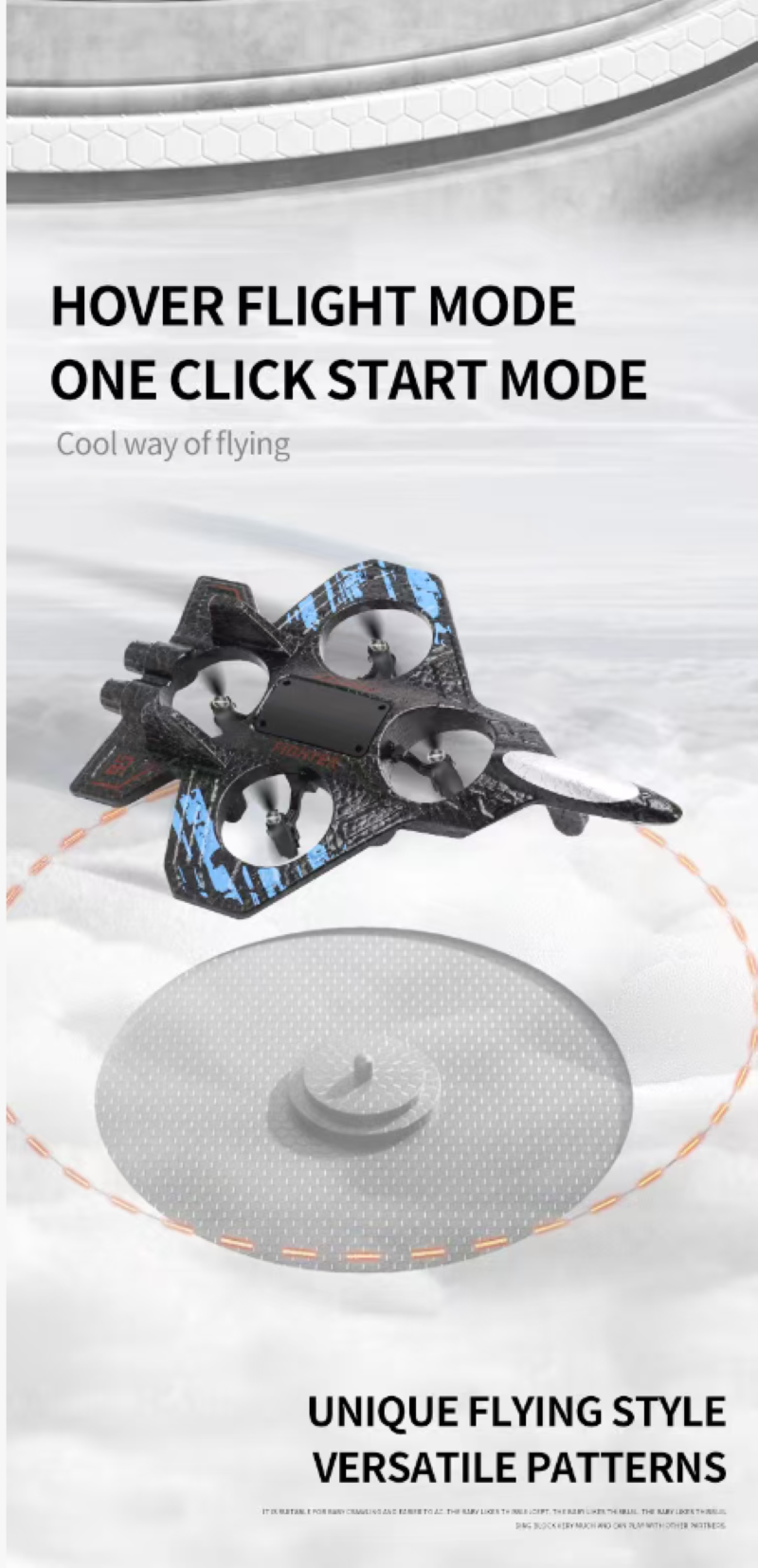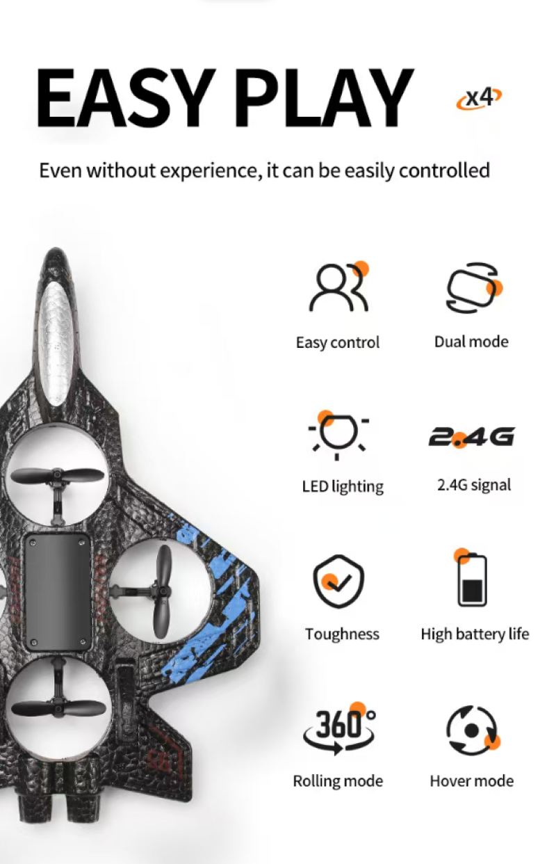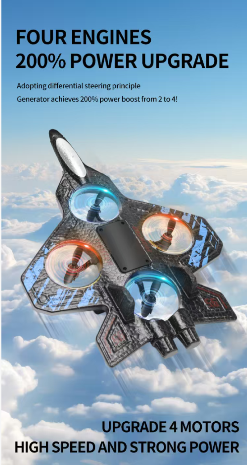 It is an "aerial toy" with both good appearance and strong capabilities: The black and blue camouflage on the fighter jet shell gives it a futuristic look. The EPP lightweight material is shock-resistant and durable, so it won't break even when flying close to obstacles at low altitudes. The four-axis power combined with gravity sensing allows beginners to easily control it - a one-click hover is stable as a compass, and the joystick steering is smooth and silky, like actually piloting a fighter jet.