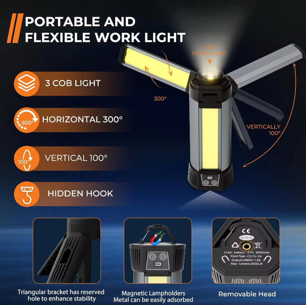 Are you still bothered by insufficient lighting and limited tools during maintenance? This **multi-functional portable work lamp** features powerful performance of "flexible lighting + multi-scenario compatibility", making it a "lighting assistant" for auto repair, home decoration, and outdoor work.
