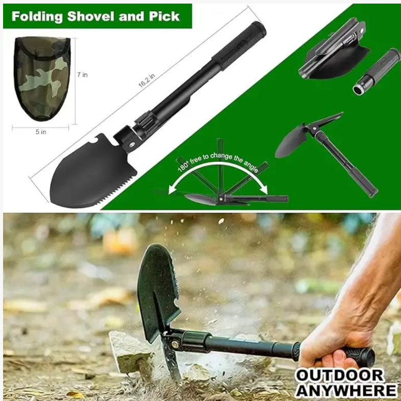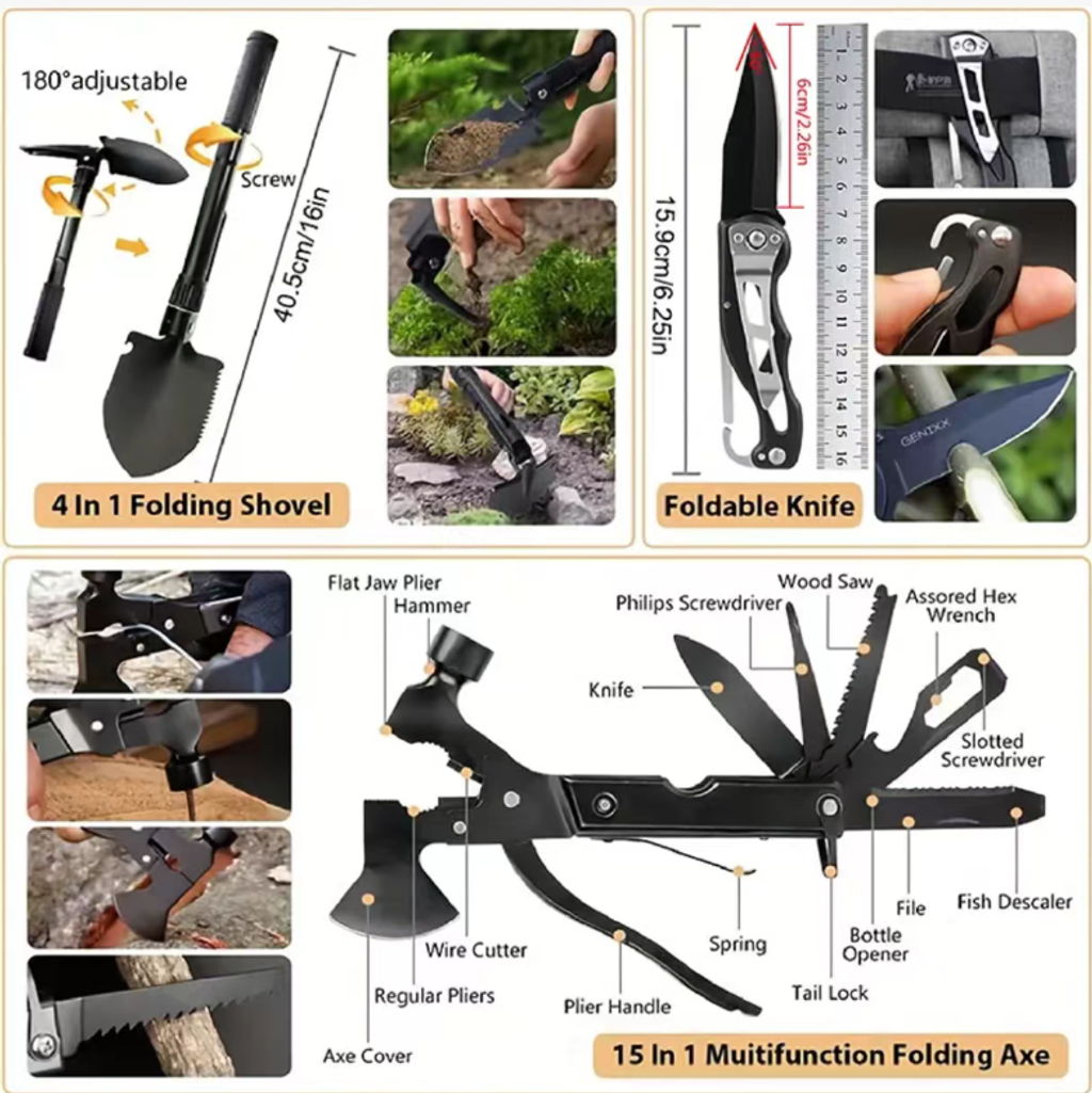 This outdoor toolkit is an outdoor mobile safety container: 4-in-1 shovel, 15-in-1 axe, multi-functional spoon covering camping operations, first aid kit + reflective blanket for emergencies, flashlight + umbrella + rope + compass covering all the details. It can be hung on the backpack seat, waterproof and portable. Perfect for hiking, driving, and carrying it with you when you go out, ensuring your outdoor security.