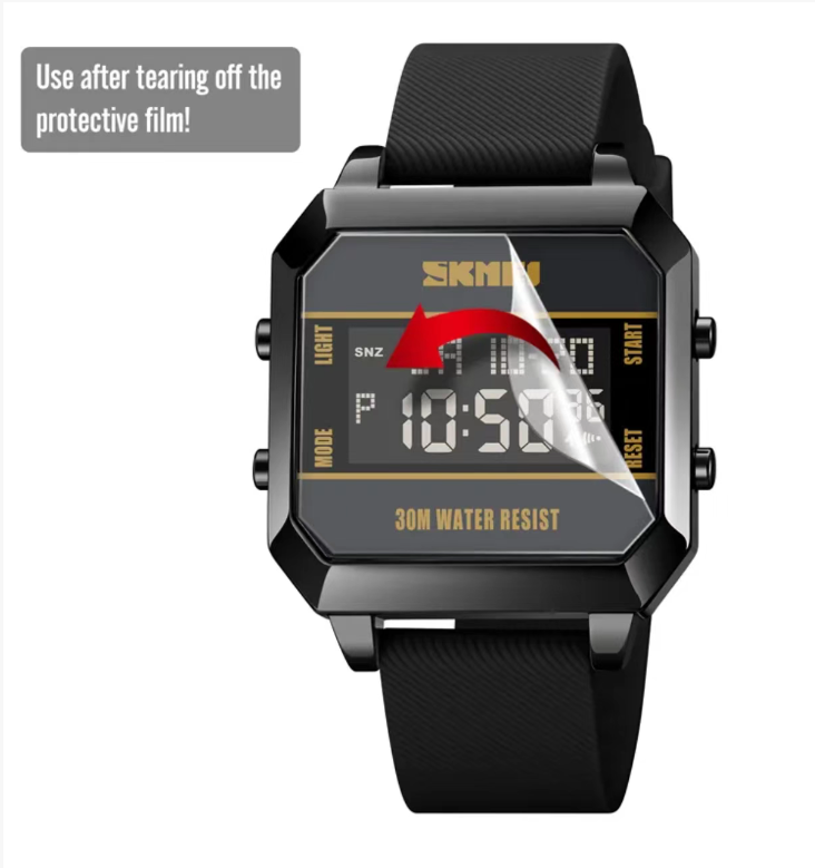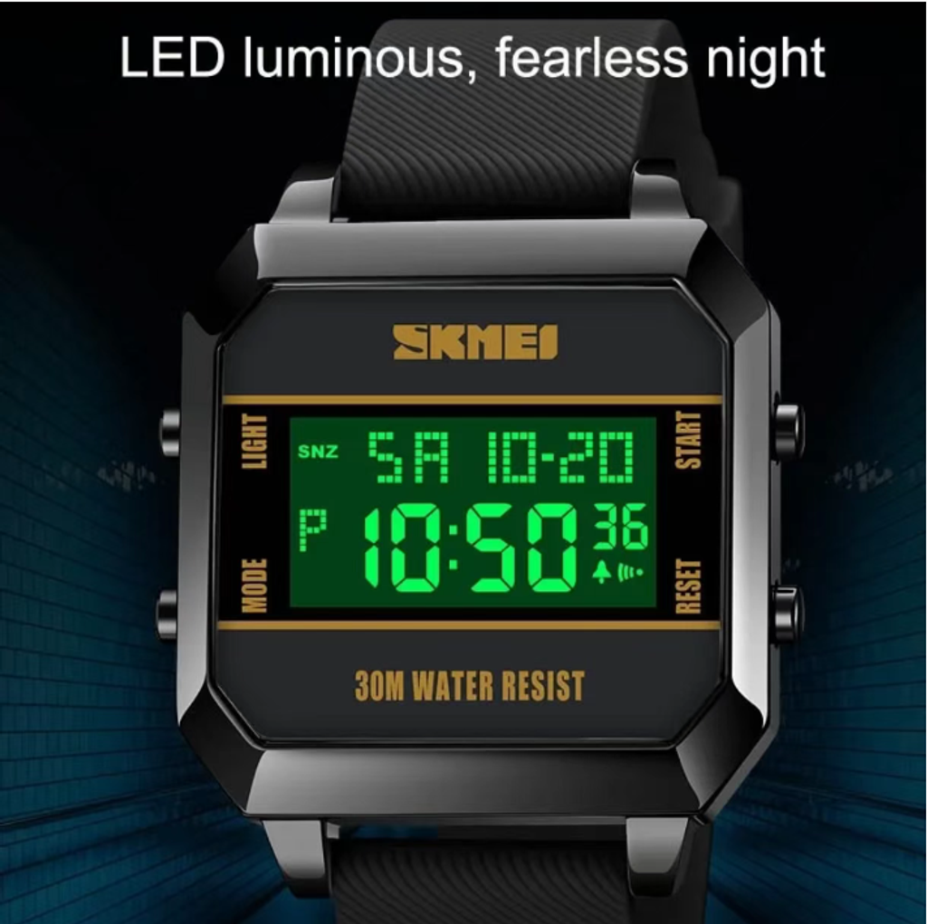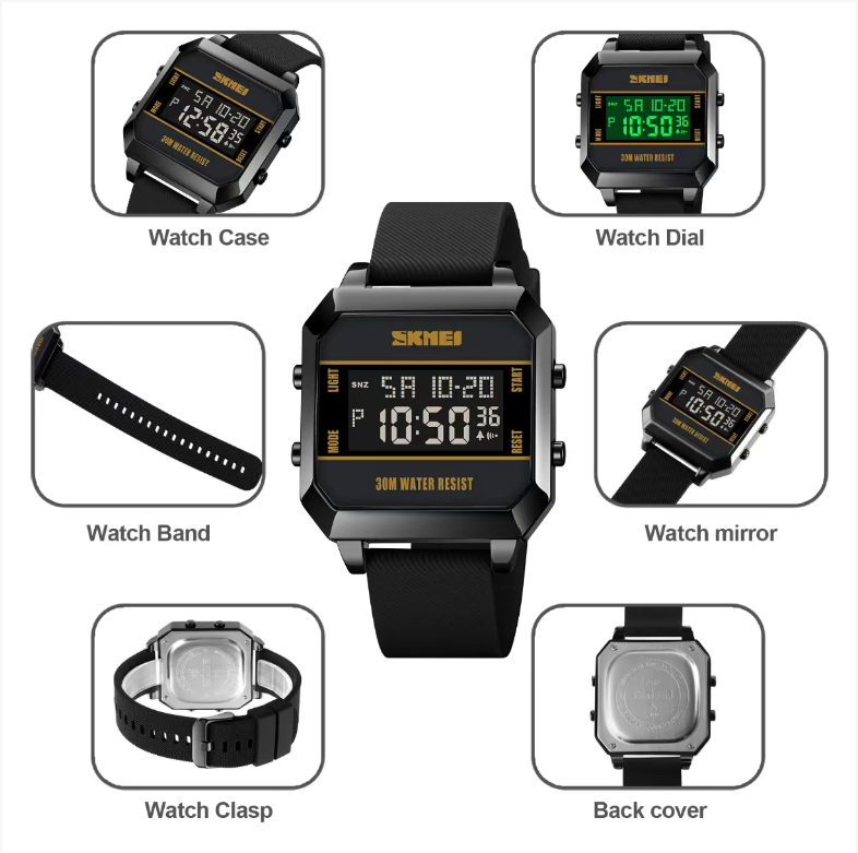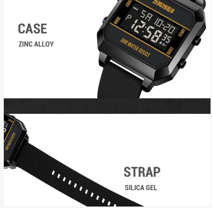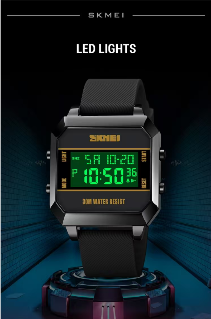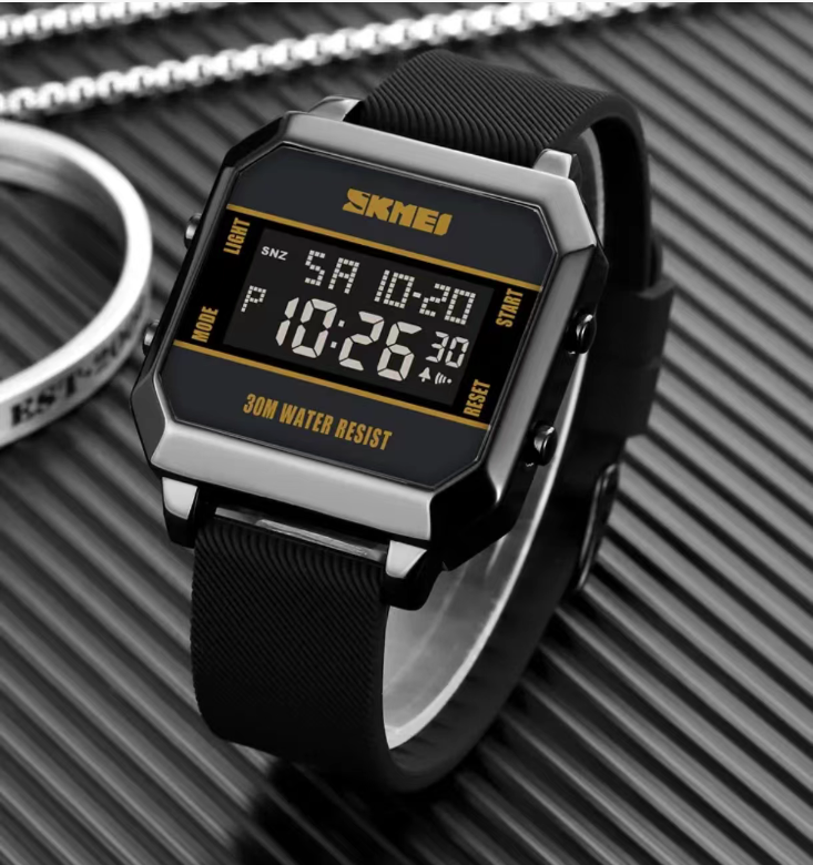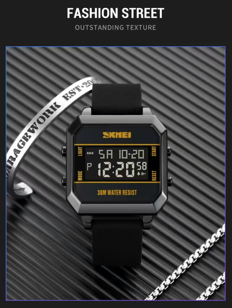 It is a harmonious blend of retro and practicality: the square-shaped case and the black and yellow contrasting dial are the classic style of American retro fashion. Wearing it with cargo pants and baseball jackets can create a relaxed street vibe. The digital screen clearly displays the time, date, and day of the week, and it also has a backlight function. You don't need to touch your phone to check the time at night; simply press a button and the screen will light up.