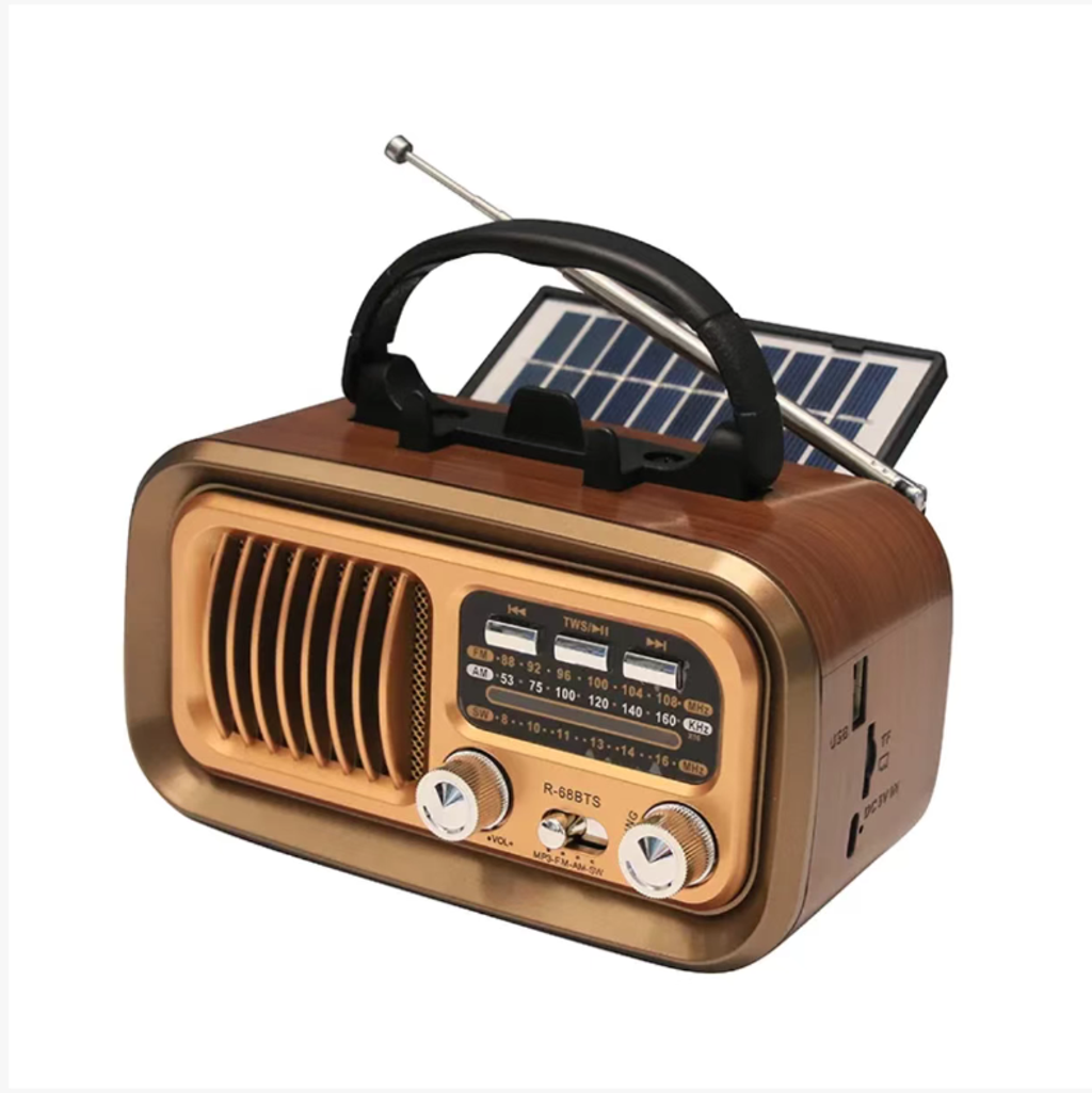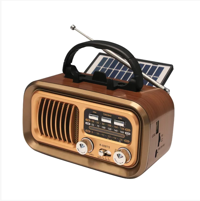 This solar multi-band emergency radio has a retro wooden appearance. It supports dual-device Bluetooth connection to create a stereo sound. It offers full-band radio reception + solar power , hand-crank , USB power supply for three types of power sources. In emergency situations, it can receive warnings. in daily use, it can be used as a Bluetooth speaker. It is small and portable, and is an audio equipment that combines both appearance and practicality!