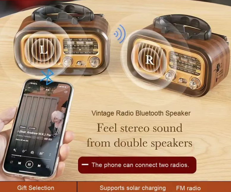 Its retro appearance can be regarded as a time capsule: the wooden texture box combined with metal knobs and dials recreates the classic feel of radio equipment from the last century. Placed at home, it is the "style take on" of soft furnishings, and held in hand, it is the "appearance-level C position" of an outdoor scene. What's even more amazing is that it supports dual-device Bluetooth connection, allowing your phone to simultaneously connect to two devices, instantly creating a surround sound field. At a camp party or while listening to music at home, you can enjoy a cinema-level auditory experience.