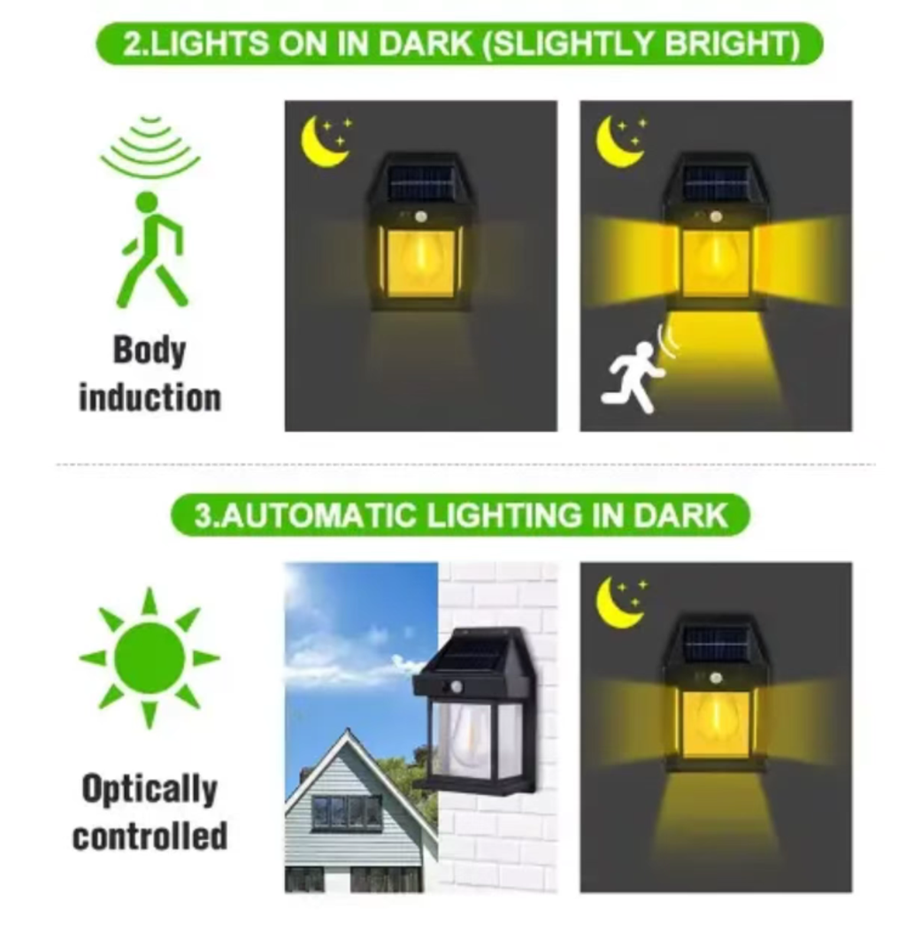 As night falls, the solar-powered house lights come to life with their intelligent sensing capabilities. The built-in infrared sensor module can respond promptly upon detecting human activity, automatically lighting up the lights. Whether it's a warm welcome for family members returning home or a warm glow for visitors arriving, it can instantly create a safe and comfortable atmosphere. Moreover, this sensing method is not only convenient but also significantly saves energy, avoiding unnecessary waste. After people leave, the lights will automatically turn off, being both practical and environmentally friendly.
