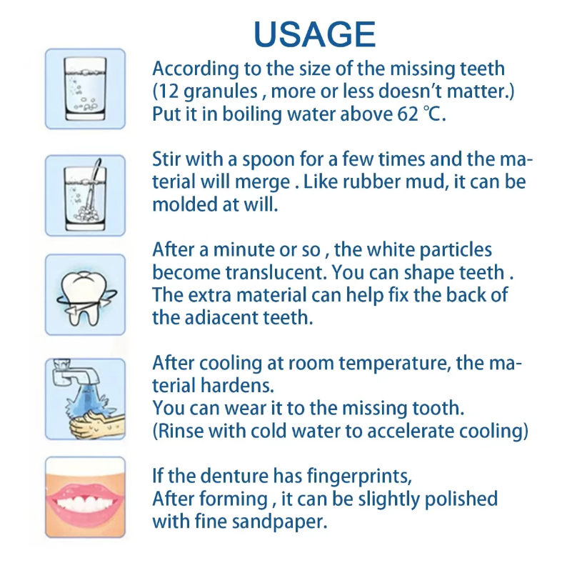 It is the "temporary substitute" for missing teeth: The process is so simple that you don't even need to learn it - heat it to soften it, then shape it to fit the gap where the tooth is missing. After cooling, it can be temporarily inserted into the gap. You can smile freely during meals and photoshoot without covering your mouth. The material is non-toxic and reusable. After use, clean it and put it away. You can take it out and use it again the next time you go out.