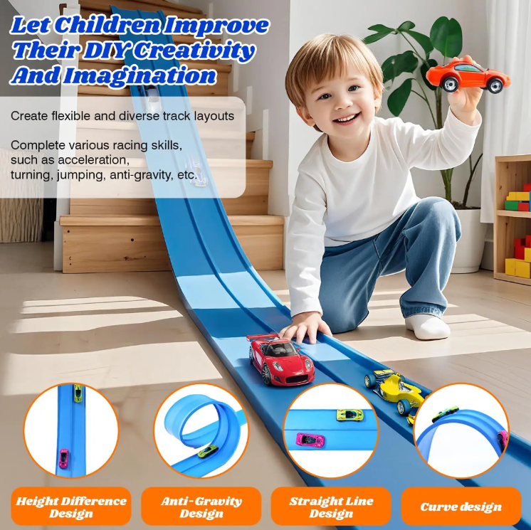 The scene adaptation is also very considerate: small tracks can be built in indoor living rooms or game areas, and large racing tracks can be expanded in outdoor courtyards or lawns. Whether exploring alone or teaming up with friends for a competition, children can enjoy different pleasures. The track material is safe and durable, and it won't deform even when bent randomly. Children won't be afraid of breaking it no matter how they build it, and parents will feel more at ease.