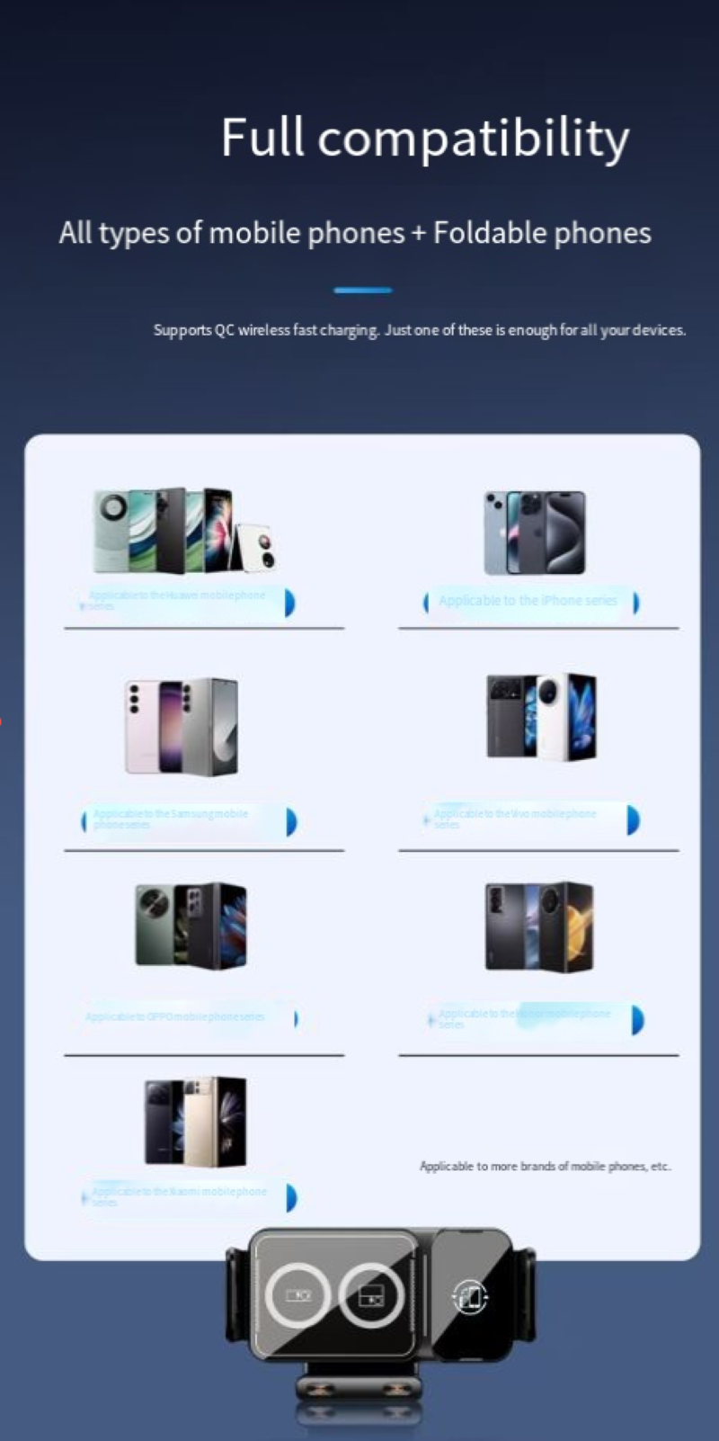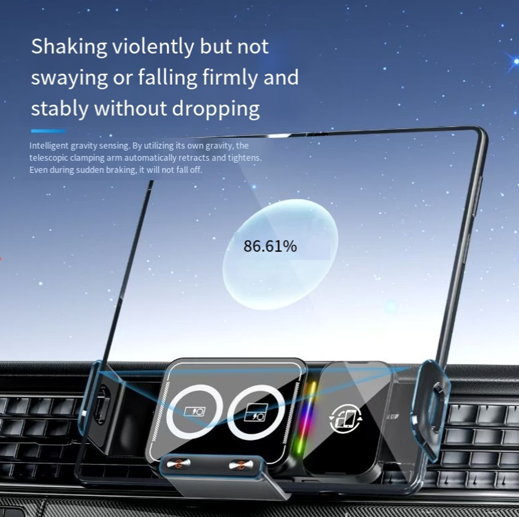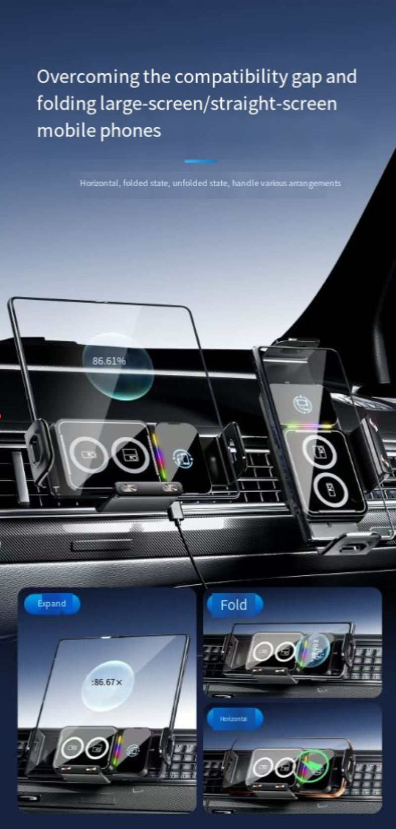 This wireless charging stand is compatible with all models, with the gravity-sensing arm automatically tightening. It remains stable even during sudden braking or jolts. It can be extended and retracted with one hand with a single click. It can switch between portrait and landscape modes with a single click. The wireless fast charging is line-free. The foldable screen can also be securely adapted and fastened. It is convenient and tidy to use for commuting and driving.