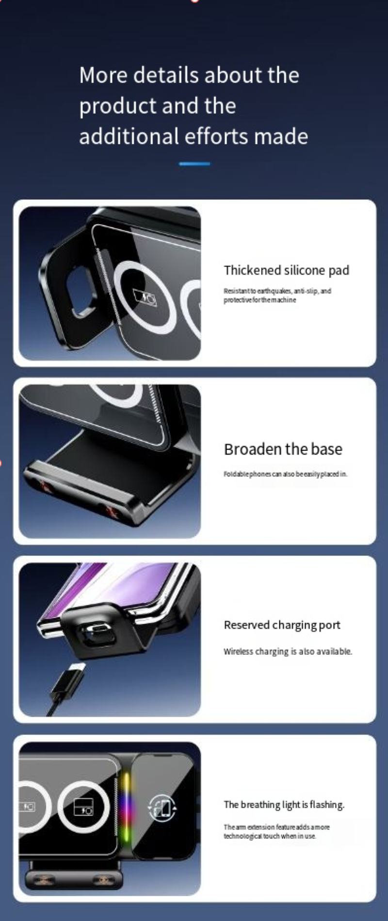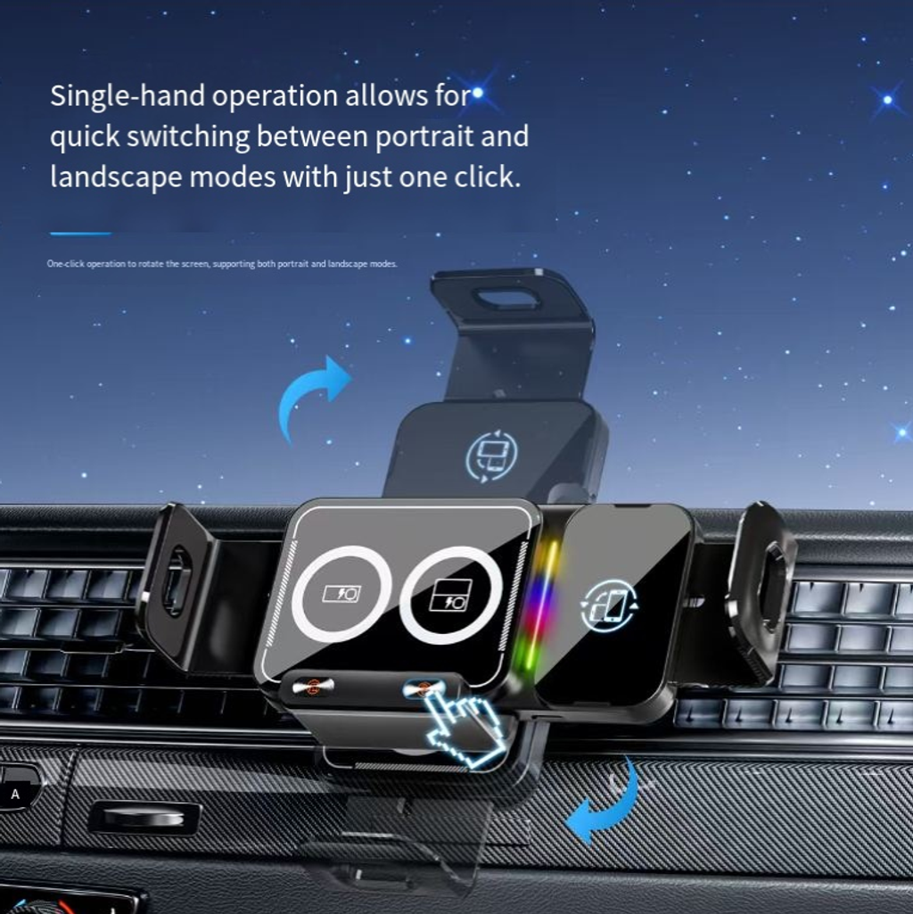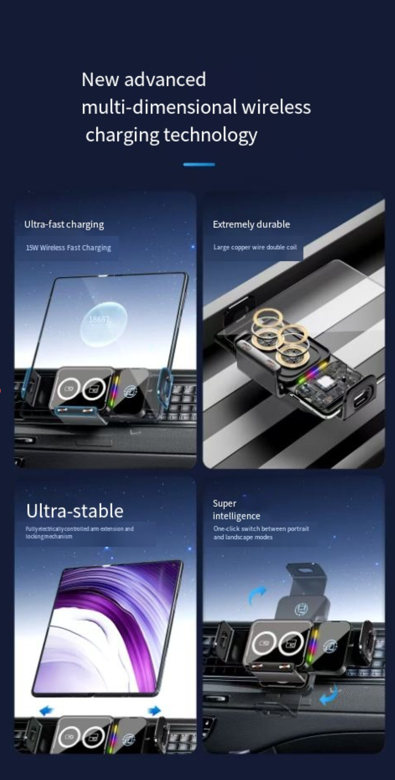 This wireless charging stand is compatible with all models, with the gravity-sensing arm automatically tightening. It remains stable even during sudden braking or jolts. It can be extended and retracted with one hand with a single click. It can switch between portrait and landscape modes with a single click. The wireless fast charging is line-free. The foldable screen can also be securely adapted and fastened. It is convenient and tidy to use for commuting and driving.