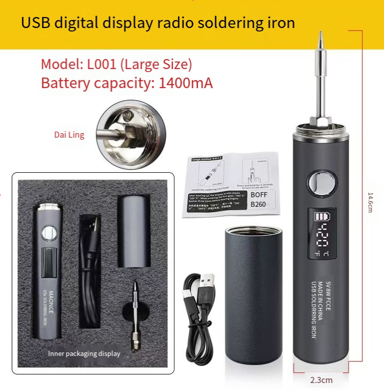 This wireless digital soldering iron Type-C can be charged via USB. It has a 1400mAh battery that lasts for 30 minutes. The digital display offers five temperature settings ranging from 260 to 420 degrees Celsius. It also features an LED light to assist in dark corner soldering. It has an automatic sleep function, making it convenient for home repairs and DIY soldering. It eliminates the hassle of tangled wires.