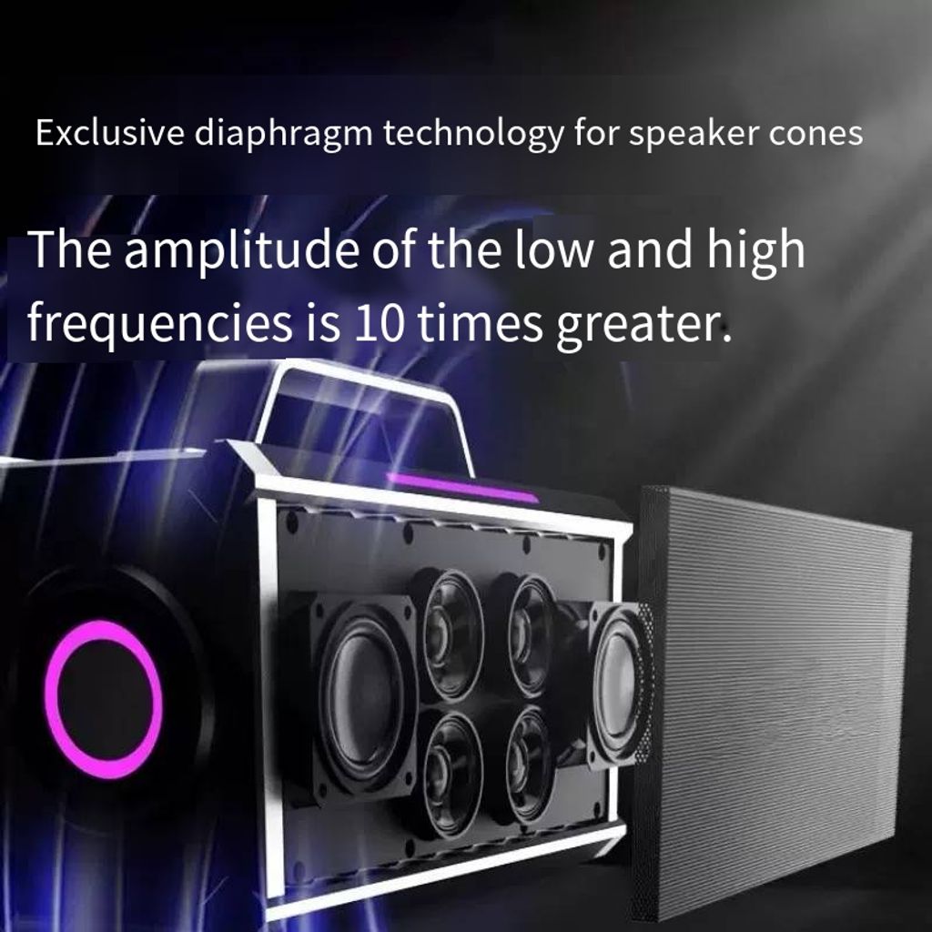 Who could resist the tough-looking appearance with mech shell and RGB glow? It has both handheld and belt-mounted modes, allowing you to carry it around or hang it on your belt for camping, commuting, or parties. 5 units of sound output + exclusive diaphragm technology, with full dynamic range of high and low frequencies. Equipped with dual DSP chips, it enables you to switch between karaoke and music playback with one click. Even for live streaming and voice chat, it can instantly transform into a professional sound card. The long battery life completely eliminates the anxiety of outdoor power supply. The ambient light rhythmically changes with the music. Press the play button, and instantly become the center of attention - not just a speaker, but your mobile music stage.