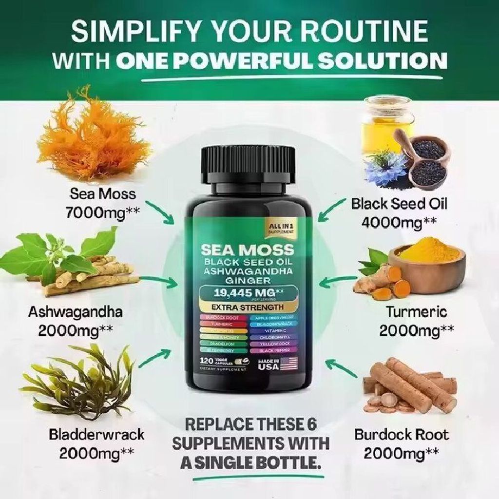 Still struggling to take multiple supplements? This Sea Moss multi-vitamin capsule, with a 19,445mg ultra-concentrated formula, combines 12 natural ingredients such as Sea Moss, black seed oil, South African aloe vera, turmeric, and bladderwrack in one bottle. It directly replaces 6 single supplements and helps you simplify your health routine!