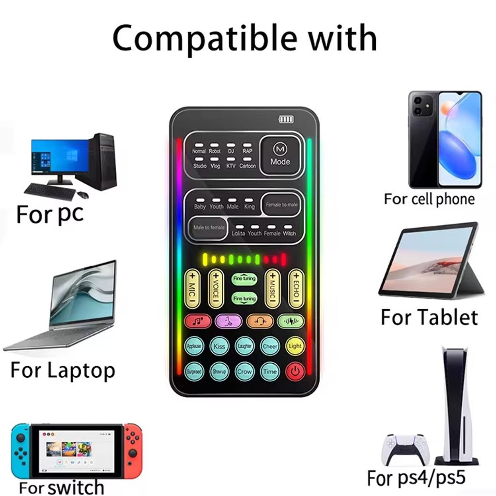 Voice transformer converter, 8 sound effects + 10 electronic sounds, one-click switch between girl, mature lady, and middle-aged man voices. Simple operation without the need for drivers. Beginners can master it instantly. One device can handle up to multiple accessories. Perfect for live streaming to attract fans, teaming up for gaming, and various activities. It offers free and joyful voice quality that is fully optimized!