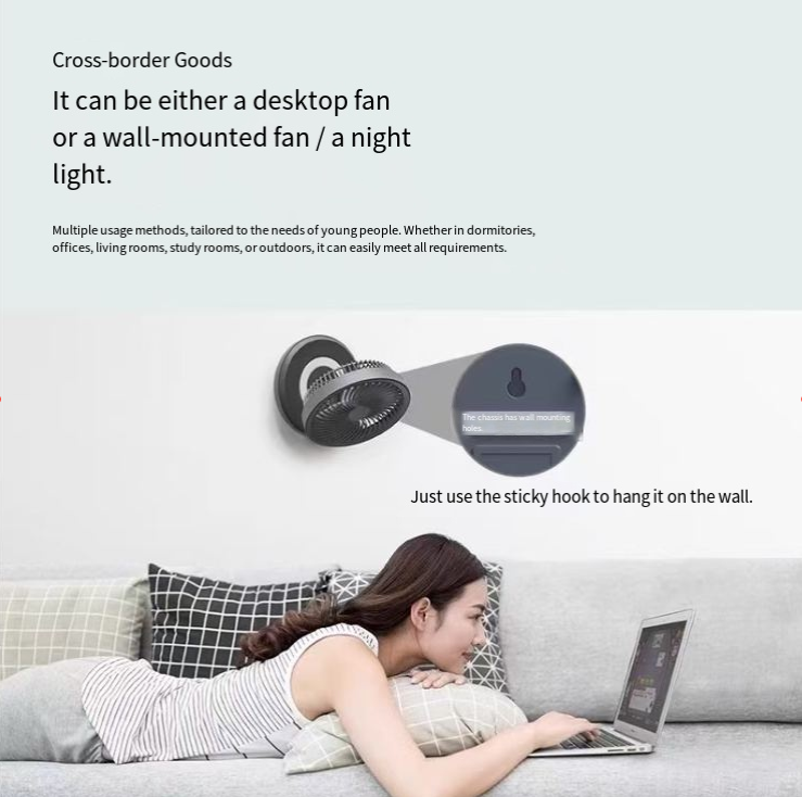 It is a desktop fan, compact and space-saving, placed on the desk during work. The gentle airflow disperses the heat, enhancing work efficiency. It is also a wall-mounted fan, which can be easily installed without drilling holes. When cooking in the kitchen, it can be hung on the wall, circulating the air quickly and dispersing cooking fumes and heat. After taking a bath, it can be hung up to accelerate air circulation and eliminate dampness and unpleasant odors. It is also a portable fan, with a compact design that is easy to carry. When camping or in a vehicle, simply place it anywhere and it can provide a refreshing breeze. From home to outdoors, from fixed to mobile, it meets all your desires for coolness with its "freedom of form".