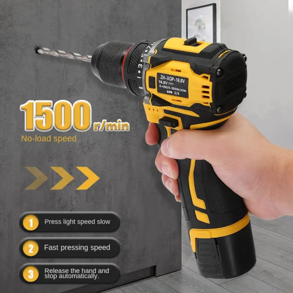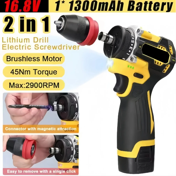 It is a convenient spirit, with a "one-click switch" design that enables seamless conversion between drill bits and spadefiles, and the magnetic connector firmly attaches the accessories, eliminating the need for cumbersome operations. The 16.8V 1300mAh lithium battery provides long-lasting power, the wireless design completely frees you from the constraints of cables, allowing you to flexibly perform tasks in confined spaces and high-altitude operations. What's more, it is equipped with LED lighting, enabling precise work even in dim corners.