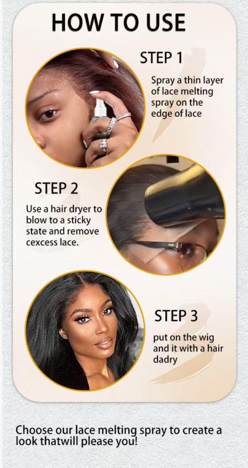 Wig styling lotion. Using non-greasy technology, it enables the wig to fit naturally and provides all-day waterproof and oil-resistant protection, ensuring stability and preventing it from falling off. Order today and you will receive 3 bottles of wig lace smoothening styling care spray. It also contains natural ingredients that can nourish the scalp, making it the perfect choice for achieving a perfect hairstyle and showing confidence!