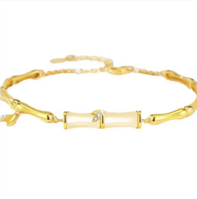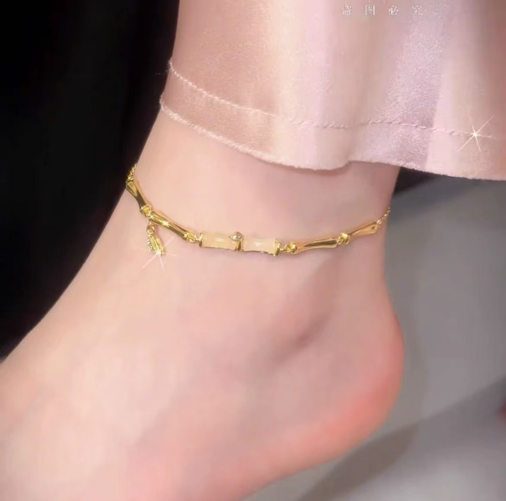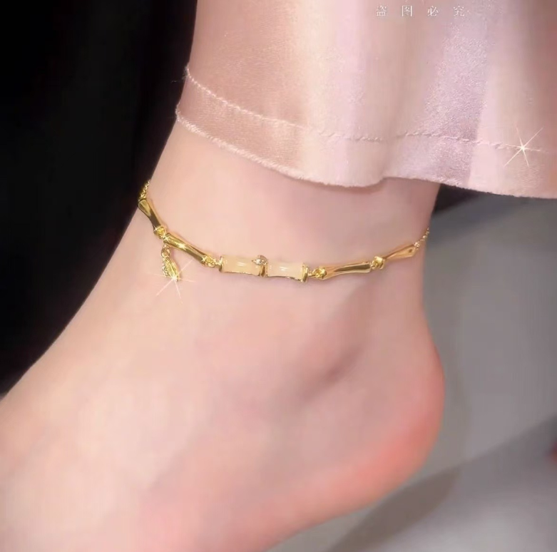 Its design is like squeezing the bamboo shadows of the south into the ankle area: the chain body is engraved with the texture of bamboo nodes in gold, and each section is connected so crisply that you can feel the faint grooves resembling bamboo. Unlike the cold and hard metal chains, it is not so rigid; the white decorative pieces in the middle, like the bamboo body just soaked in morning dew, are wrapped in soft light and have a warm texture; the fine diamonds attached beside it are like the tips of bamboo leaves, swaying gently when you lift your foot, and the light follows the chain around the ankle, being fine and captivating.