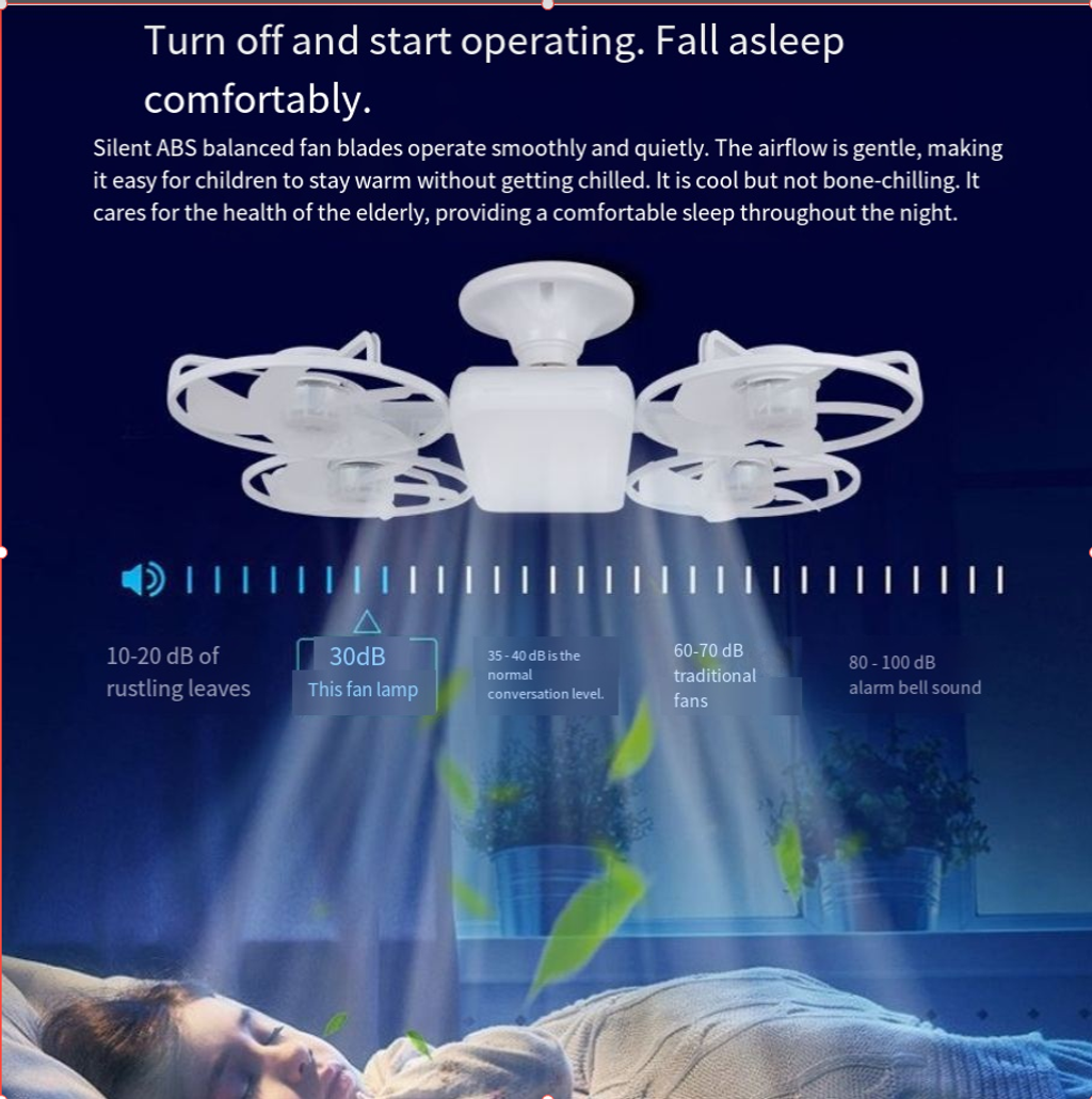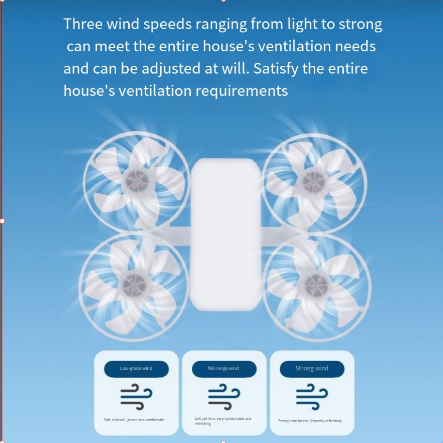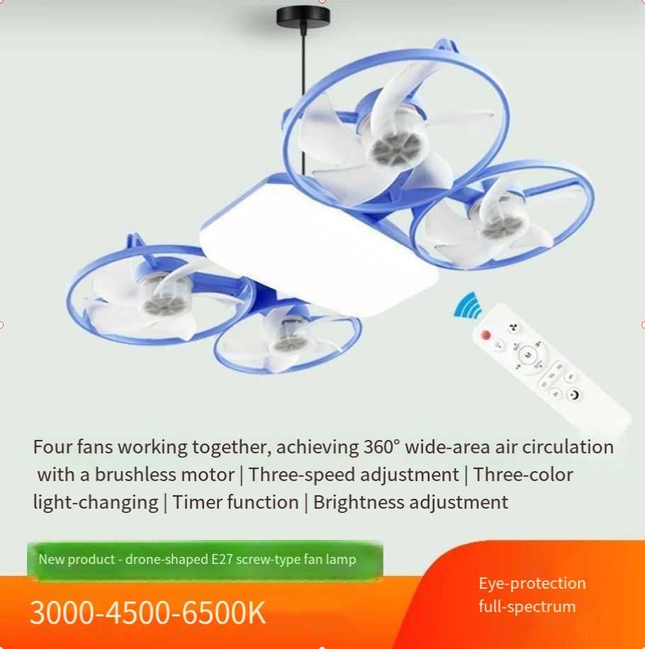 Remote control for a smart experience, comfort and freedom for the lazy. As the core highlight of this product, the remote control function completely frees our hands. No need to get up to find the switch or fumble for adjustment buttons in the dark; simply use a mobile app or voice assistant to easily control all the functions of the fan and lights, making comfort readily available. Imagine: on your way home from get off work, turn on the fan in advance via the app, set the appropriate wind speed and light brightness, and you can immediately immerse yourself in coolness and warmth upon arriving home; while watching TV in bed, if you feel the wind is too strong or the lights are too bright, you can precisely adjust them with a tap of your finger without getting up; for homes with elderly people or children, remote operation is convenient and safe, avoiding the risks of climbing to adjust things. The app also features a variety of customizable modes: in sleep mode, the fan automatically gradually slows down to a gentle breeze, and the lights slowly dim to promote deep sleep; in dining mode, the four fans can be adjusted to provide zoned airflow, creating a warm atmosphere with cozy lighting; in office mode, a uniform wind speed and bright lights are maintained to improve work efficiency. It also supports timer switching, saving energy and meeting the needs of different scenarios. Powered by robust specifications, this drone-style four-head fan light boasts uncompromising core specifications. The fan features a silent brushless motor, ensuring stable operation and low energy consumption. It delivers powerful airflow without noise interference, maintaining a quiet and comfortable environment in bedrooms or studies. The light source utilizes a high color rendering index (CRI) LED light source with a CRI of 95+, accurately reproducing the true colors of objects. The soft, non-glaring light protects the eyesight of family members. It supports three color temperature settings (warm light 3000K, natural light 4500K, cool light 6000K) and stepless dimming, allowing for easy switching between cozy home lighting and focused work lighting to meet different needs. Safety is paramount: the fan blades feature an anti-pinch design with smooth, rounded edges, along with overload protection and a power-off braking function, ensuring worry-free use. The body is made of flame-retardant materials, resistant to high temperatures and leaks, ensuring reliable performance even after prolonged use. Easy to install and compatible with various ceiling types, it's a perfect fit for both new home renovations and older home remodeling. More than just a fan light, it's an upgrade to your lifestyle. This drone-controlled four-head fan light breaks the functional limitations of traditional home products, perfectly combining technology and practicality. It's not just a tool for regulating temperature and providing lighting, but also a smart partner that enhances your quality of life—the convenience of remote control lets you say goodbye to tedious operations and enjoy the benefits of convenience; four-head zoned airflow and multi-mode lighting meet the different needs of the whole family, allowing each space to adapt to its ideal state; the floating aesthetic design adds a touch of technology and sophistication to the home, showcasing unique taste. Whether it's a cozy living room for a family of three, a stylish dining room for friends, or an efficient office space, this drone-controlled four-head fan light becomes an indispensable home item thanks to its intelligent remote control, comfortable four-head airflow, and stylish design. Choosing it means choosing a more convenient, comfortable, and technologically advanced lifestyle, putting the control of wind and light at your fingertips.